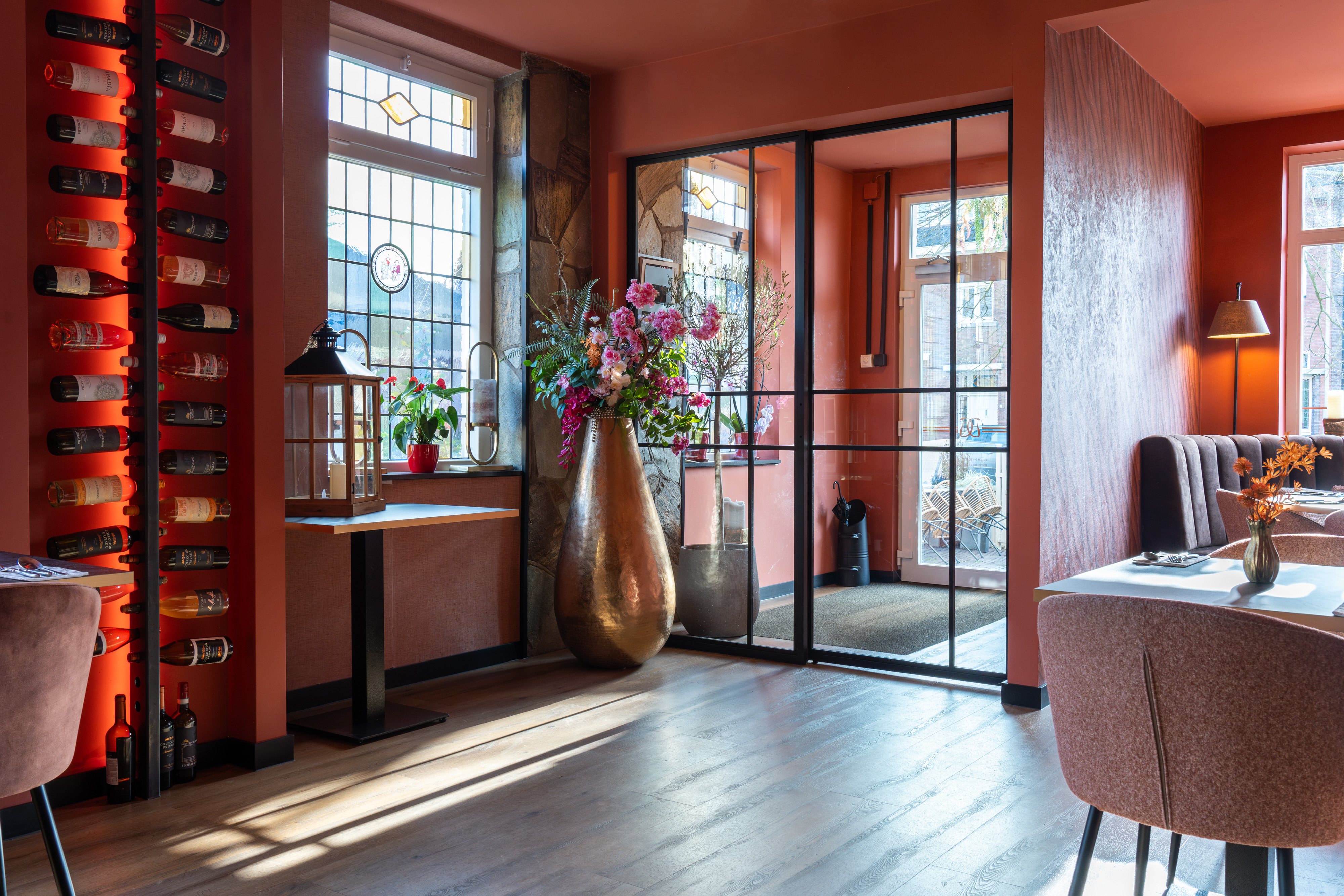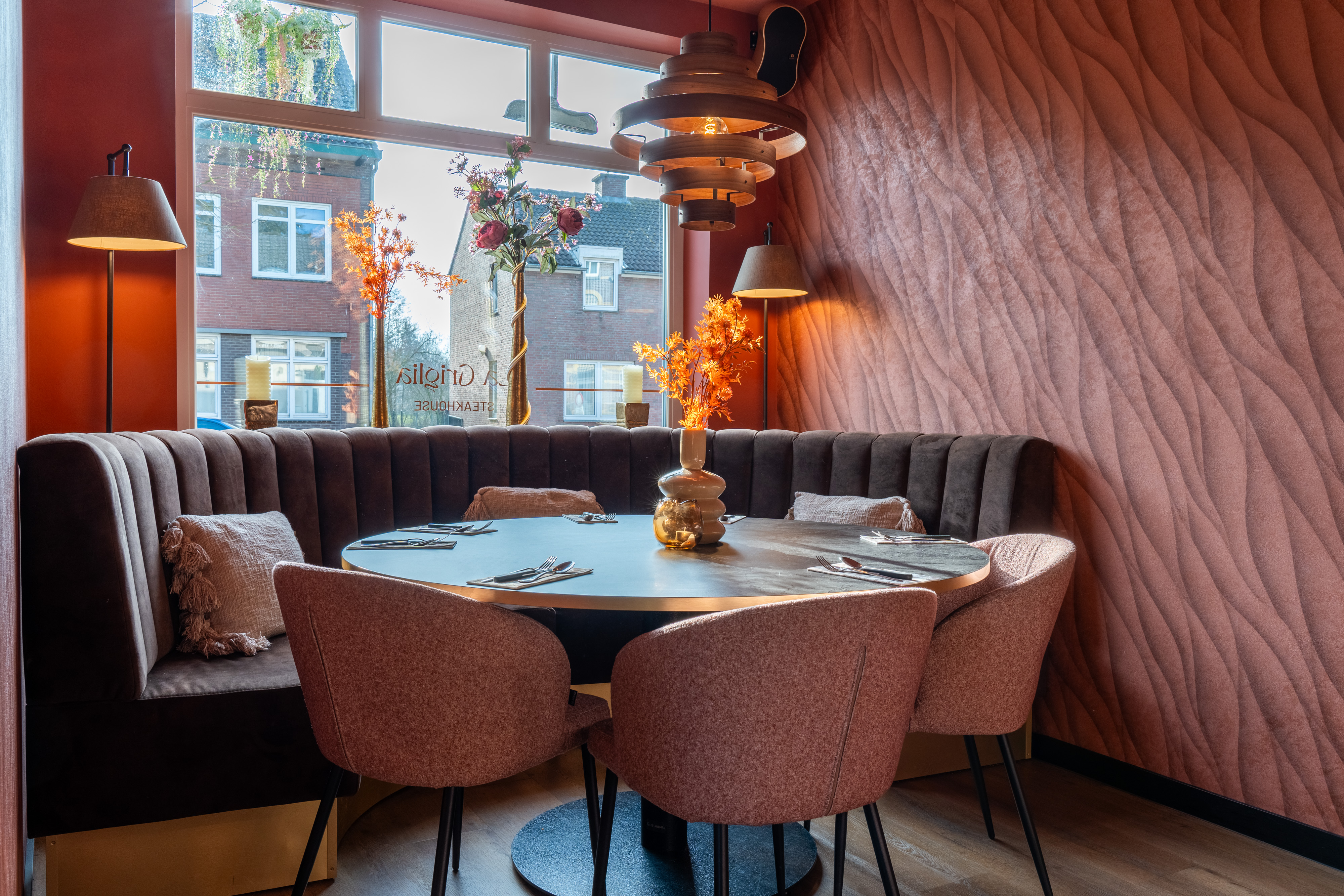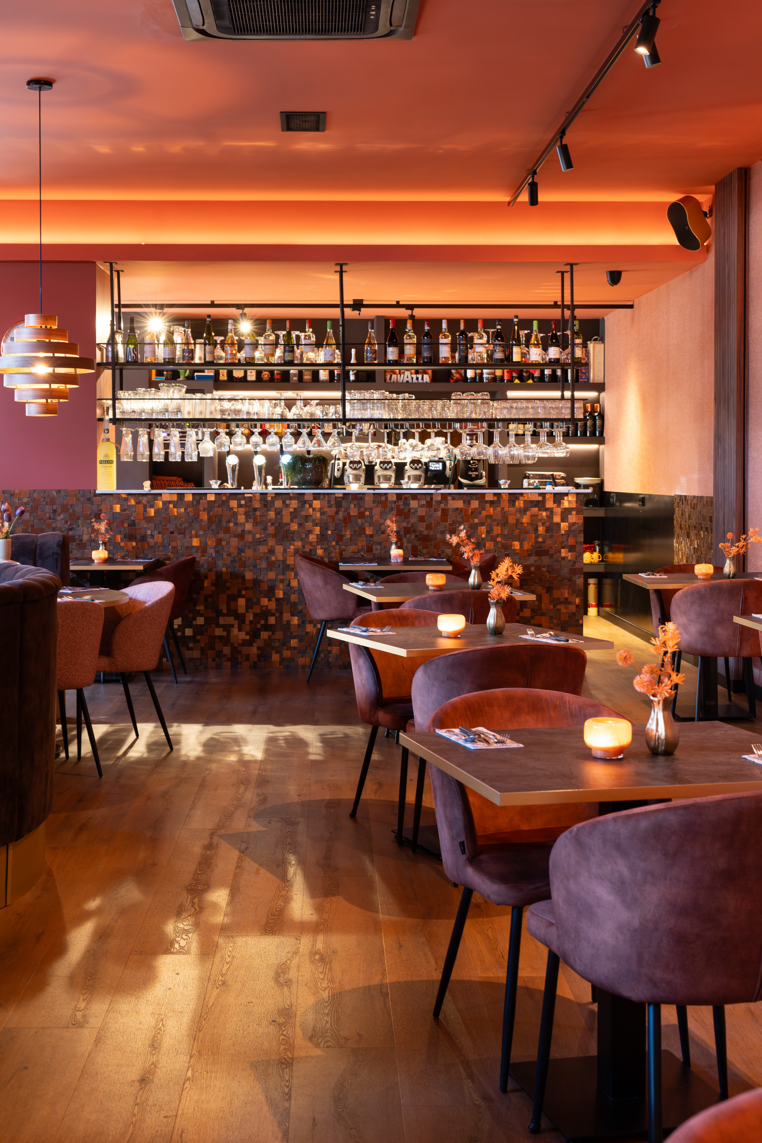 Honoring Asian traditions and heritage in the creation of this sushi restaurant, we used traditional Japanese colours such as soft greens in the colour palette, as well as a sober design in the furniture. The brass lighting and paper lanterns set the mood for this extraordinary dining experience in a former church.
