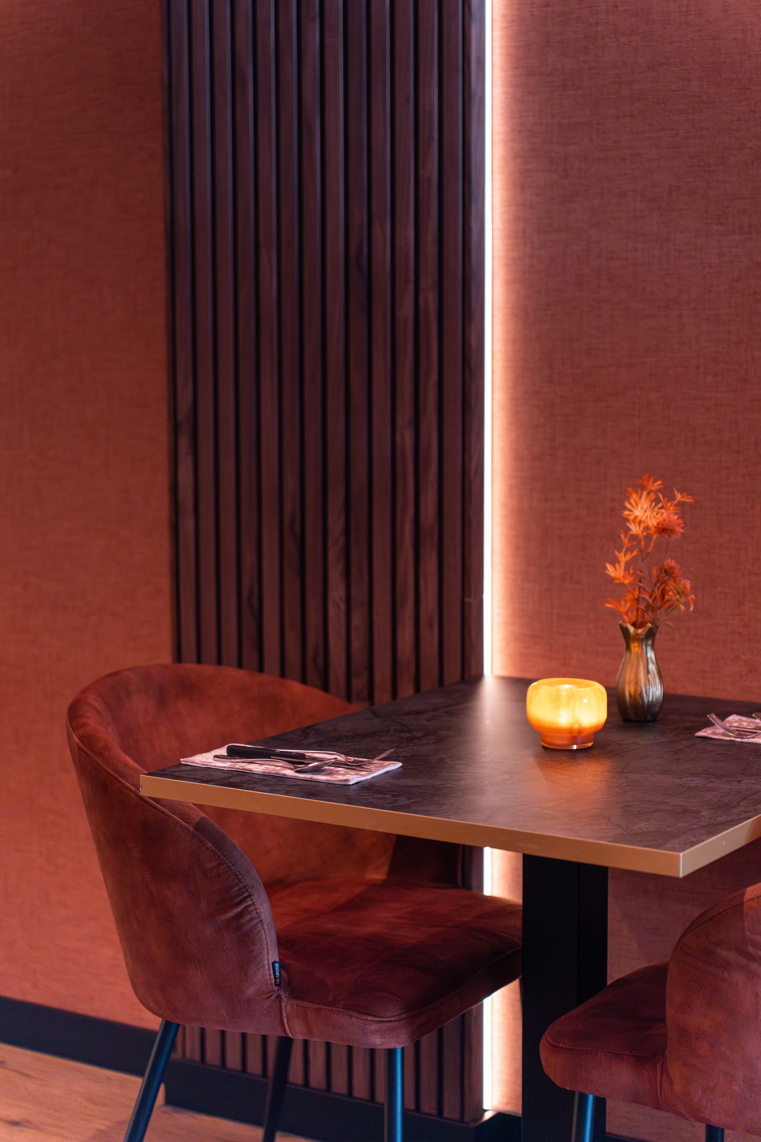 Right through the middle of the church, an onyx stone band sets the tone for the restaurant. Like a dragon, the plum velvet sofa winds over the onyx stone and acts as the centerpiece of the restaurant. The create the feeling of a den, we have implemented private dining rooms to enjoy an intimate dinner in a low dining setting, in which tradition comes to life. The altar has been redesigned into a bar. Set in a green onyx stone, it connects the bar area with the main dining area. The mezzanine overlooks the main space and offers more seating.